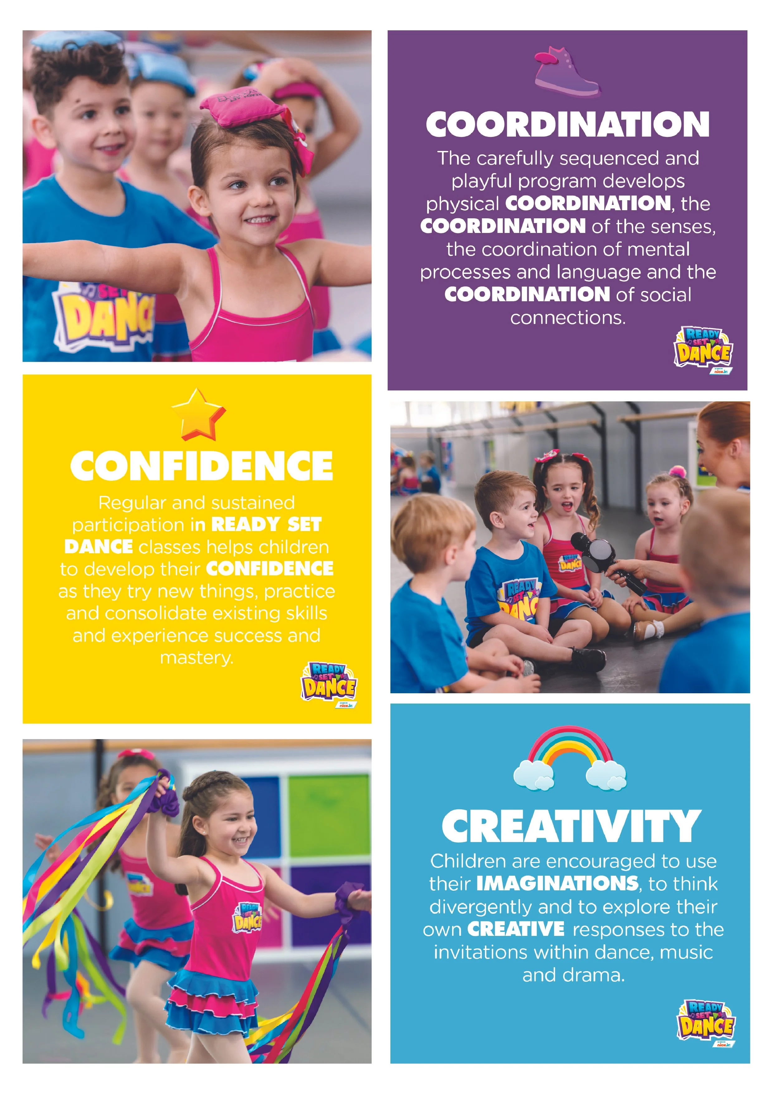 Regular and sustained participation in Ready Set Dance classes helps children develop confidence, coordination and creativity!